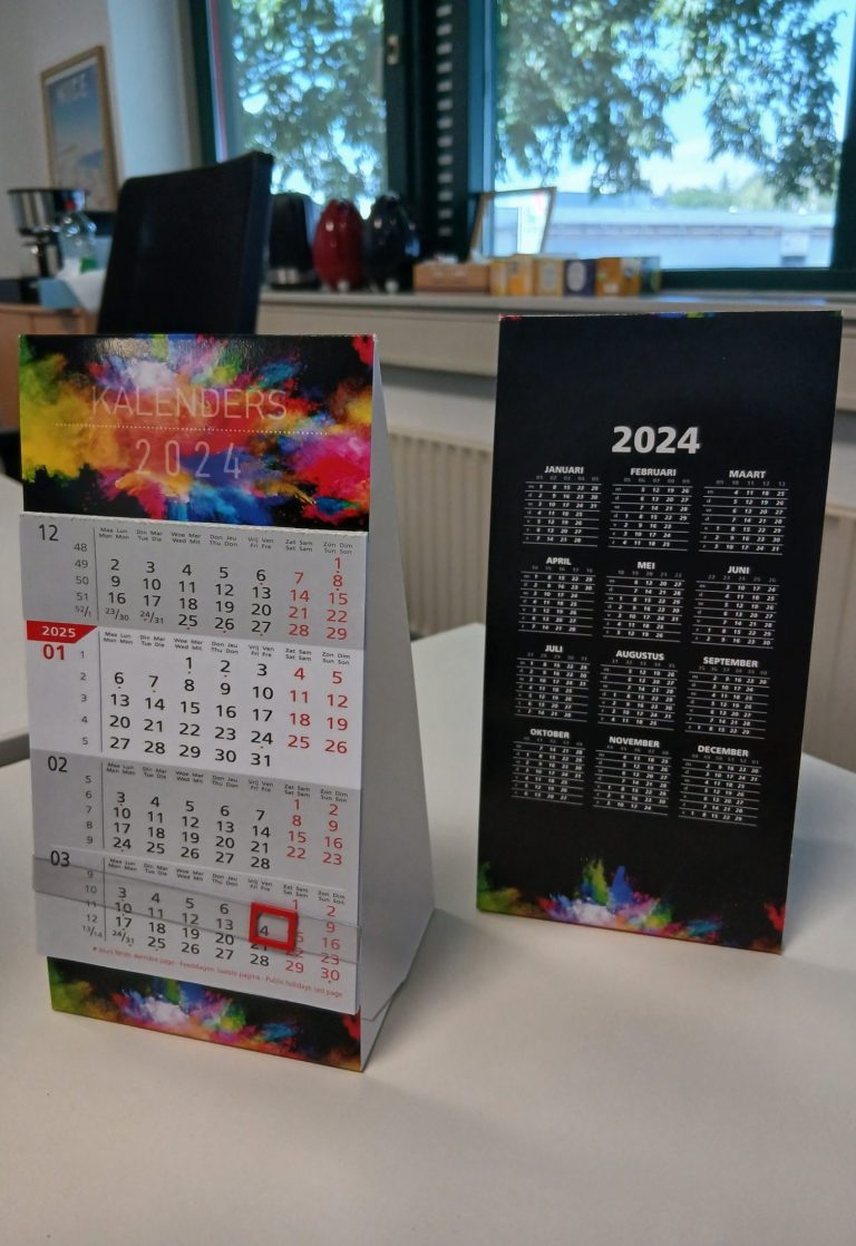 Deze kalender wordt standaard gelijmd en ingevouwen geleverd en staat uitgeklapt als een huis.