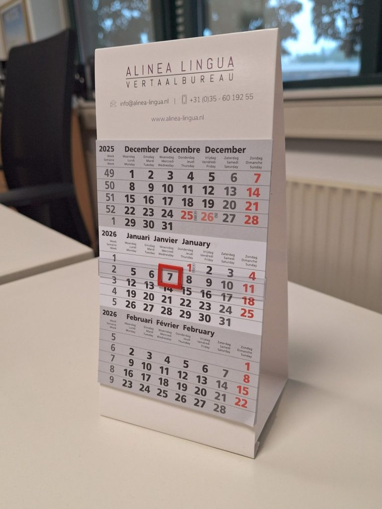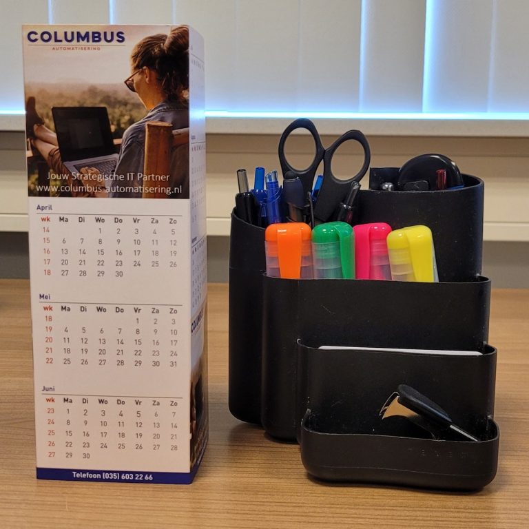 Deze kalender is een graag geziene gast bij veel bedrijven vanwege de stevigheid en overzichtelijkheid per drie maanden met datumschuiver. Het formaat en de stabiele basis van deze kalender in combinatie met de gebruikte kleuren zorgen voor een zakelijke uitstraling op een bureaublad. Uw logo en bedrijfsgegevens zijn in de door u gewenste kleuren permanent in het zicht. Op de achterkant kunt u aanvullende gegevens laten vermelden. Zo wilt u het graag hebben. De tekst is in drie talen: Nederlands, Frans en Engels.
